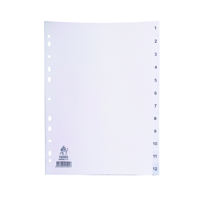 This 12-part numbered polypropylene index is a hard-wearing but affordable choice for organising your files. Made from strong, wipe-clean plastic, these dividers are multi-punched to fit almost any A4 ring binder or lever arch file. Divided into 12 parts - pre-printed with numbers 1-12 - it's a functional product that's ideal for organising files by month.