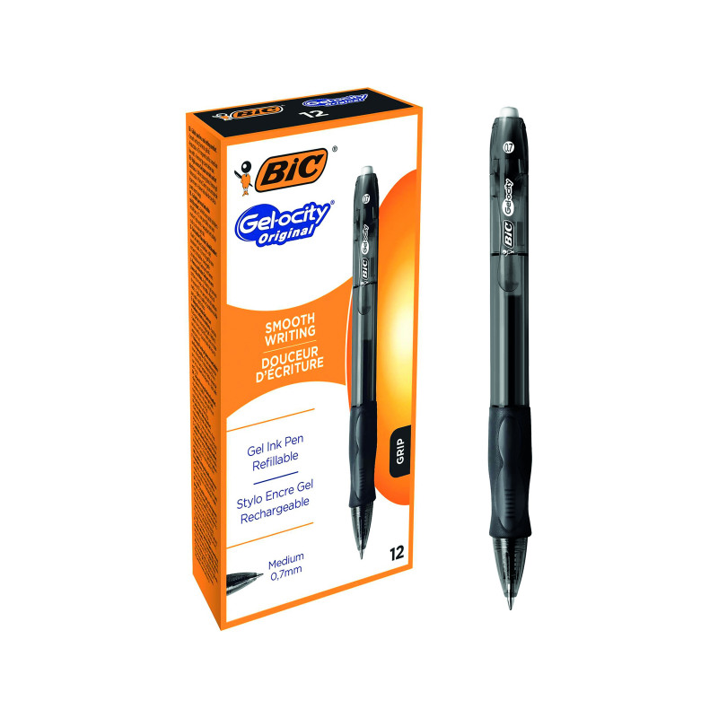 This Bic Gel-ocity Original Gel Pen features ultra smooth gel ink for even, controlled writing. The pen also features a convenient retractable design and shaped, contoured grip for comfort, even over longer periods of writing. The medium 0.7mm tip writes a 0.35mm line width and the barrel is translucent for monitoring remaining ink levels. This pack contains 12 black pens.