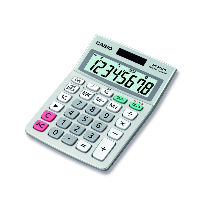 The Casio MS-88ECO is an environmentally-friendly desk calculator with both the upper and lower case made from recycled plastic. This model has a large and clear 8 digit angled display is powered by eco-friendly solar energy combined with a mercury-free battery. Functions include Tax, Currency, Mark up, correction key, 3 Digit comma markers and auto power off. The display is tilted to give an easy viewing angle. For use at home or at work.