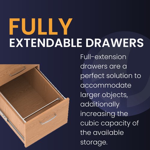 Impulse fixed pedestal | 25mm top | Full 18mm back board | 2mm abs protective edges | Steel handles | Solid box drawer construction | Fits A4 or foolscap filing (Filing rails only available on the 2 drawer variant) | Steel to steel fixings | Lockable drawers | Heat resistant Beech melamine finish