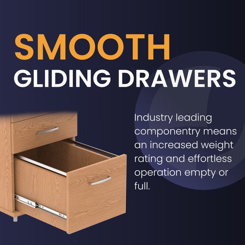 Impulse mobile pedestal | 25mm top | Full 18mm back board | 2mm abs protective edges | Steel handles | Solid box drawer construction | Filing rails fit A4 filing only (Filing rails only available on the 2 drawer variant) | Smooth running castors for mobility | Steel to steel fixings | Lockable drawers | Heat resistant melamine finish