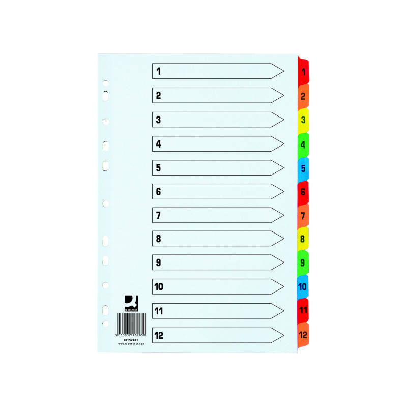 This Q-Connect 1-12 numbered index divider provides a clear and simple filing solution for your everyday office needs. The front index sheet provides space for labelling to make referencing your notes quick and easy. Made from plain white card with multi-coloured Mylar tabs for extra reinforcement, this divider is extra wide for increased visibility. This index comes with pre-printed tabs (1-12) and is multi-punched to fit standard lever arch files or ring binders.