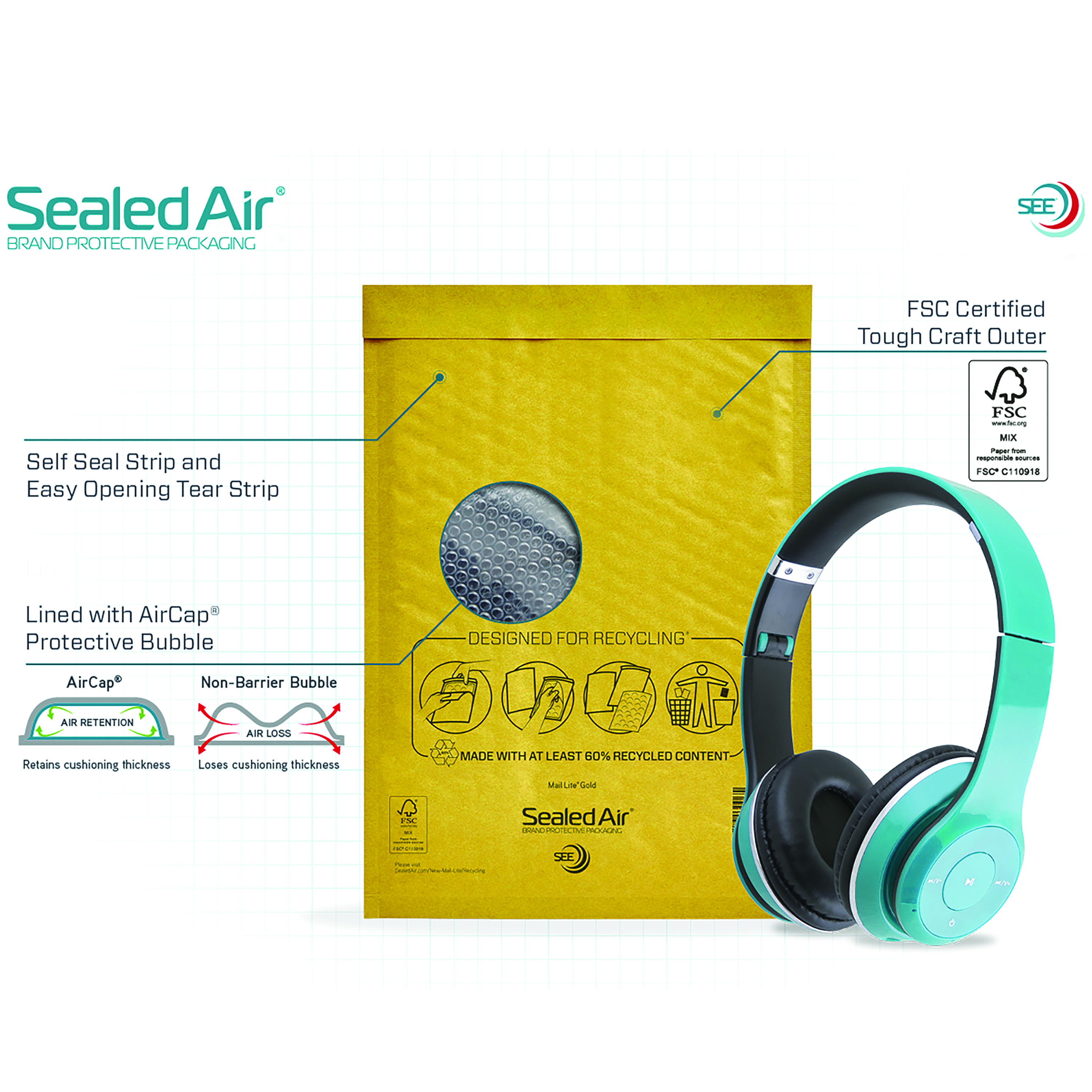 - AirCap bubble liner is made from 60% recycled content