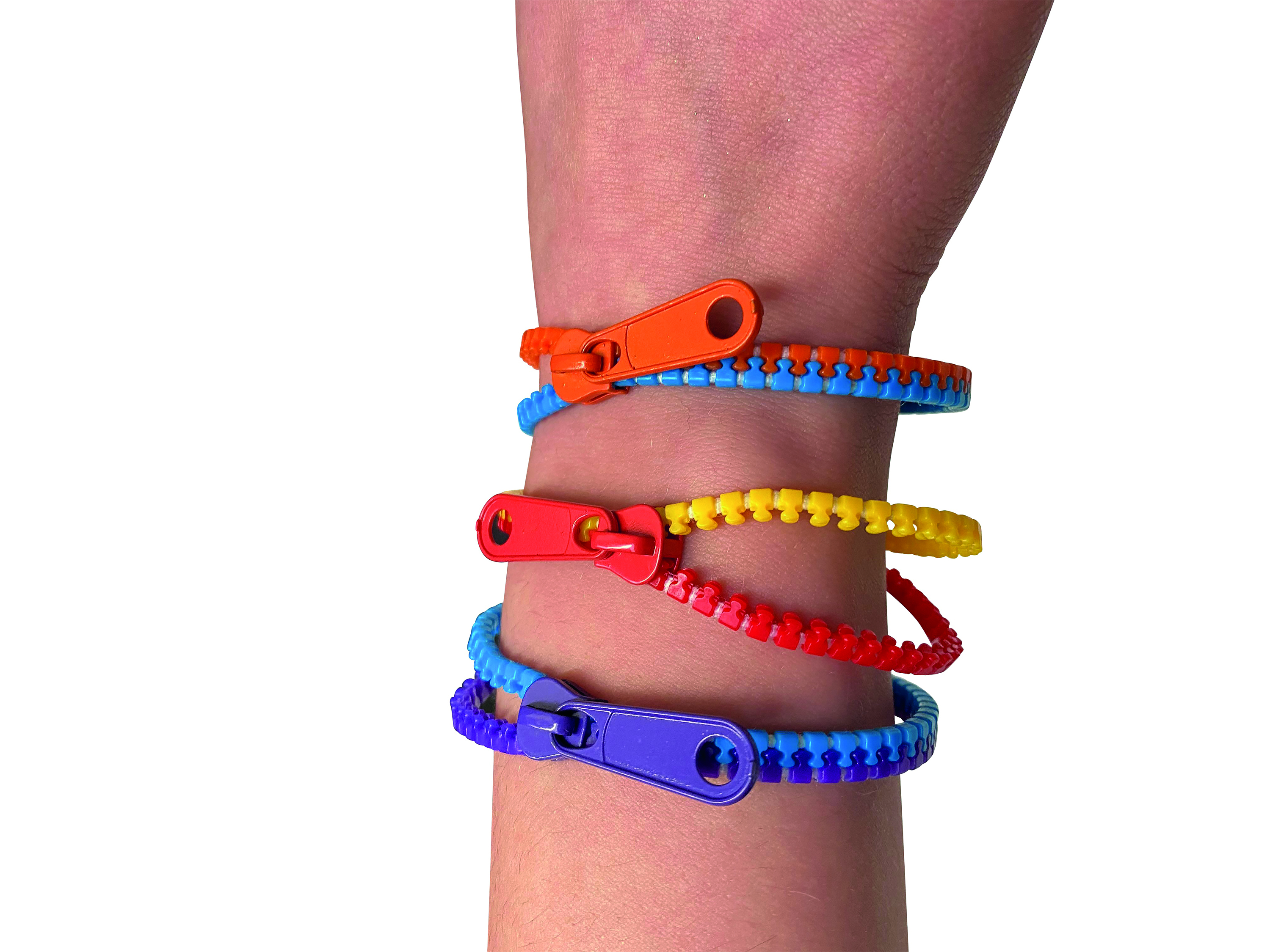 A brightly coloured sensory fidget zip that can be worn as a bracelet or looped around bags, clothes and keys so always on hand when the urge occurs to zip up and zip down. Perfect size for most childs' wrists and designed to help reduce stress, anxiety and help focus attention on other tasks. Ideal for children with ADHS, ADD, autism and anxiety.